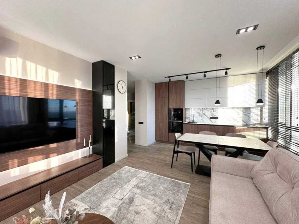 - велика просторна кухня-вітальня, в якій столова зона та зал з великим мʼяким розкладним диваном, плазмою, журнальним столиком