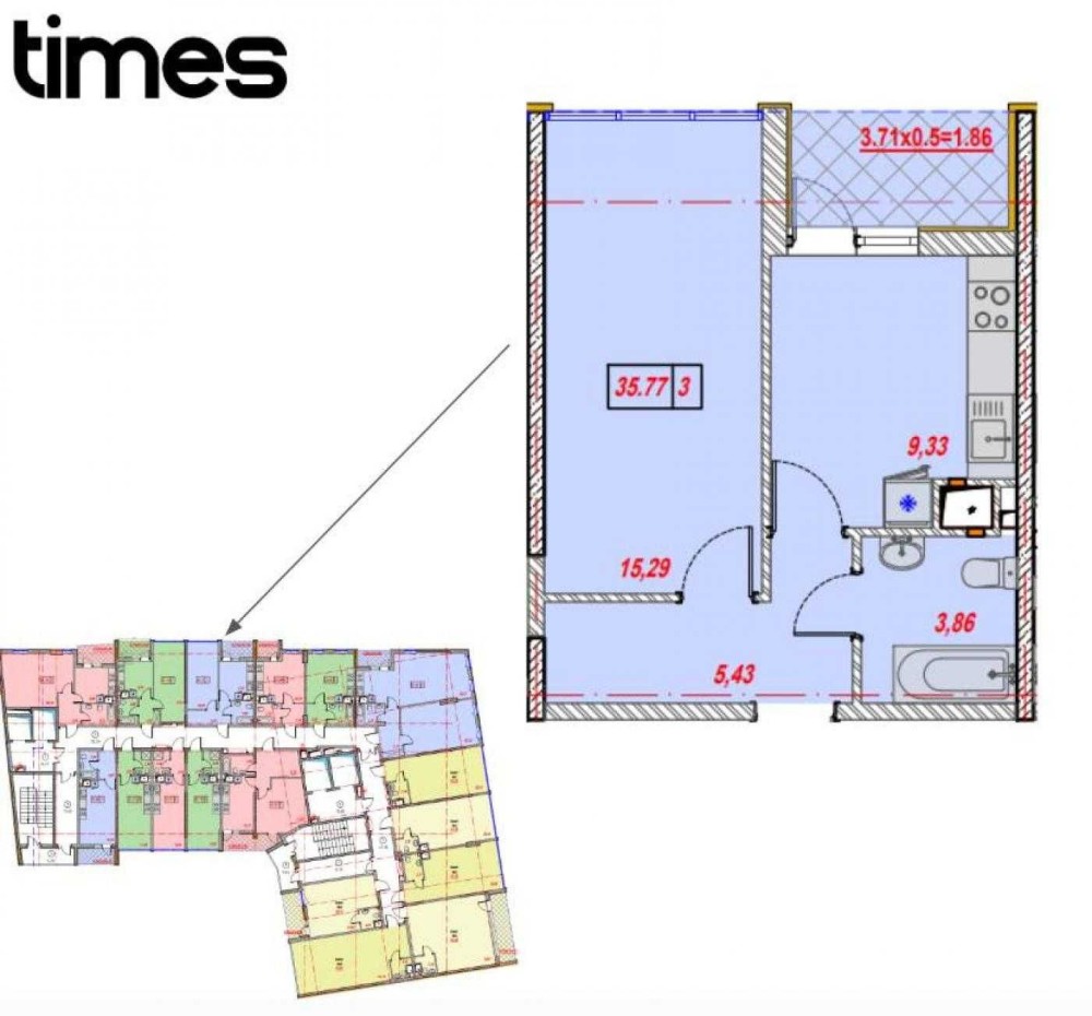 Общая площадь 35,77 м², кухня-9,33.