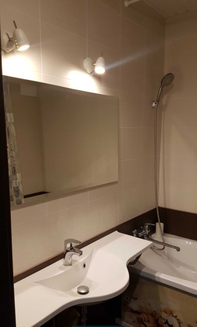 Санузел совмещенный (с огромным умывальником, зеркалом с подсветкой и полноценной ванной).