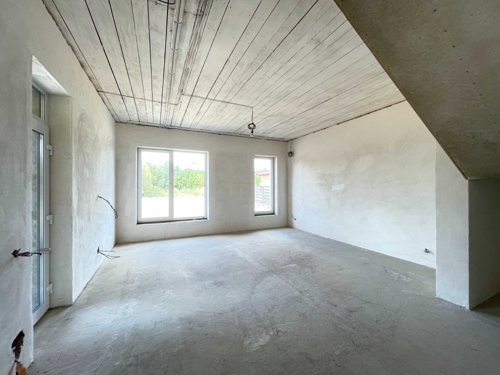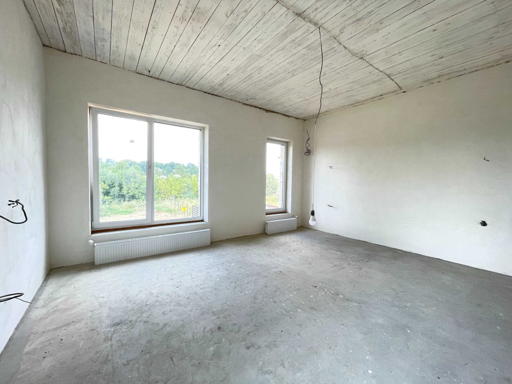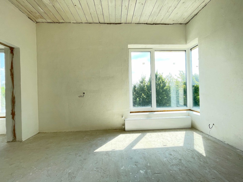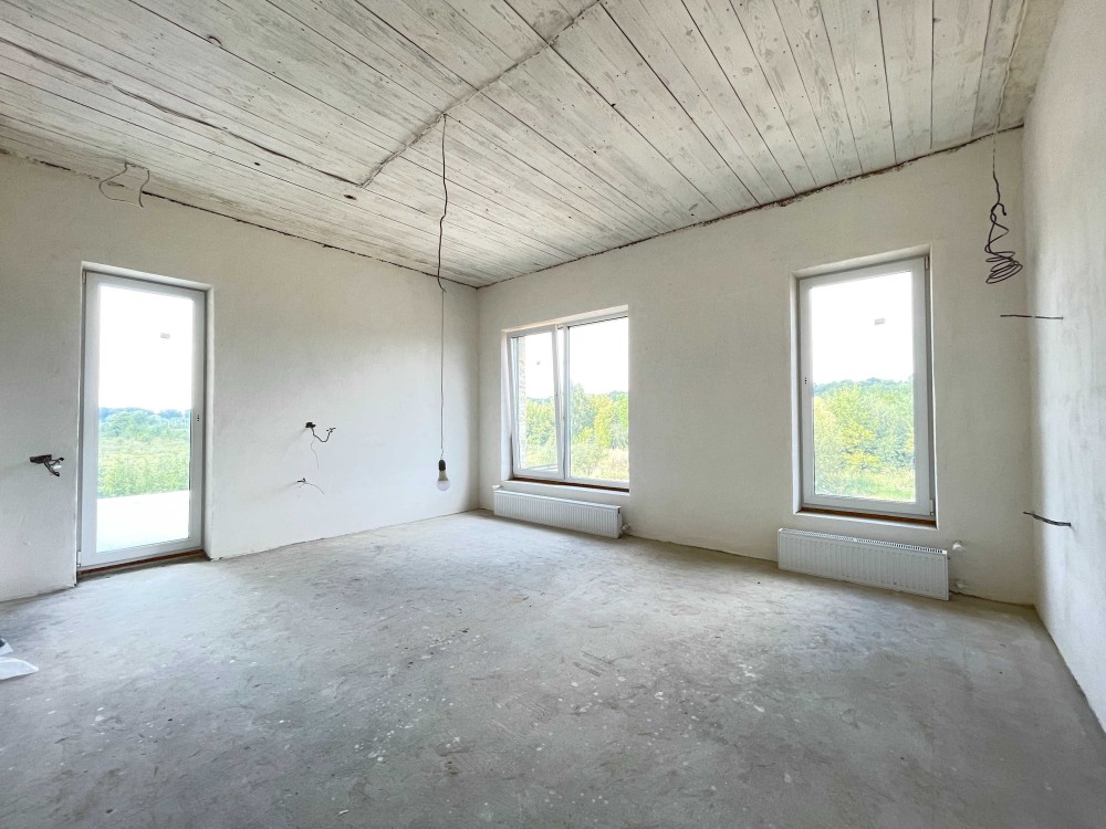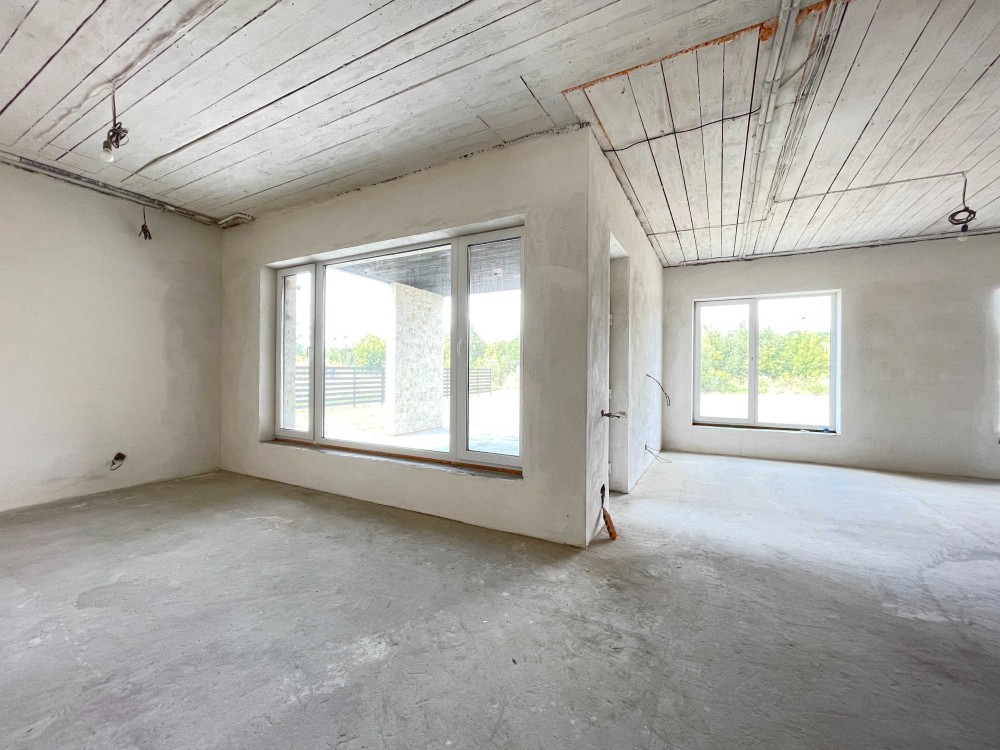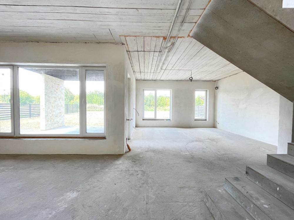 Встановлені панорамні вікна Veka, розведена тепла підлог, опалення, сантехніка та електрика по будинку.