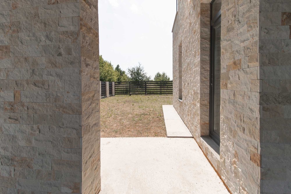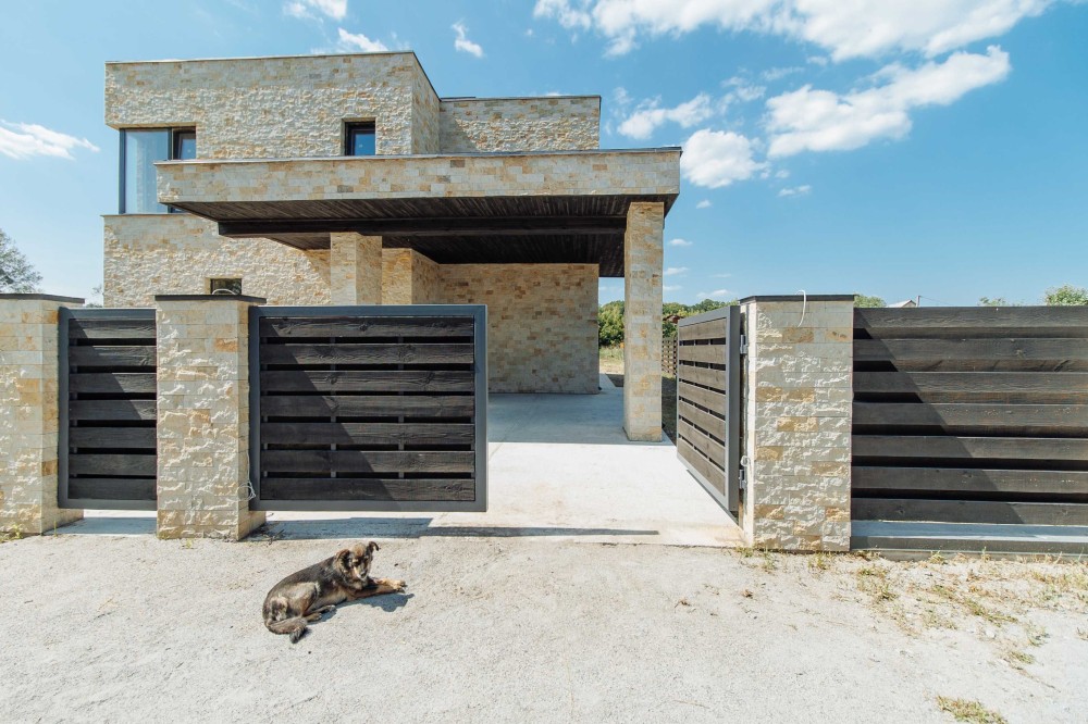 Фасад будинку оздоблений каменем та деревом.