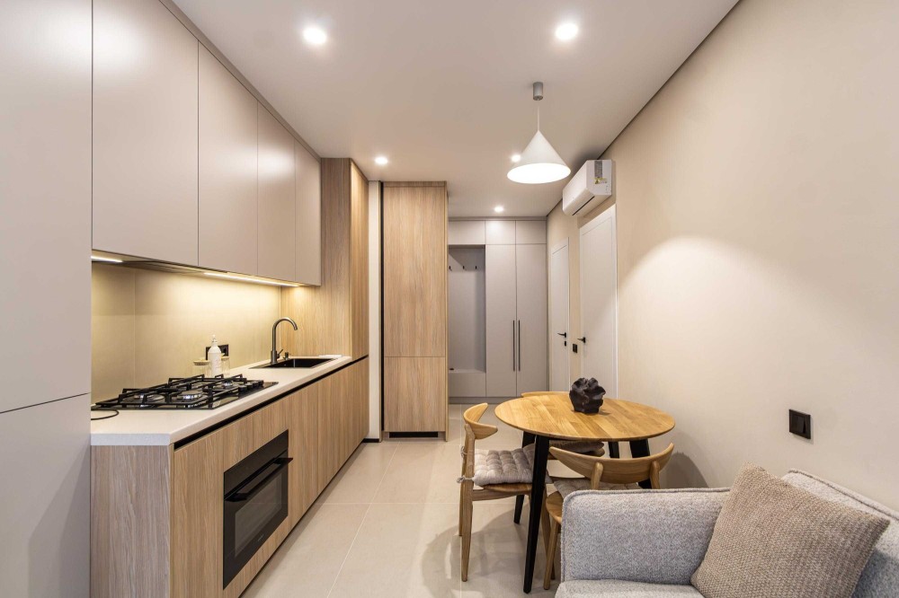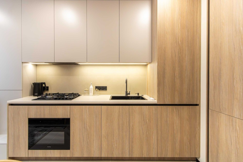 - Вбудована кухня з духовкою та варильною поверхнею