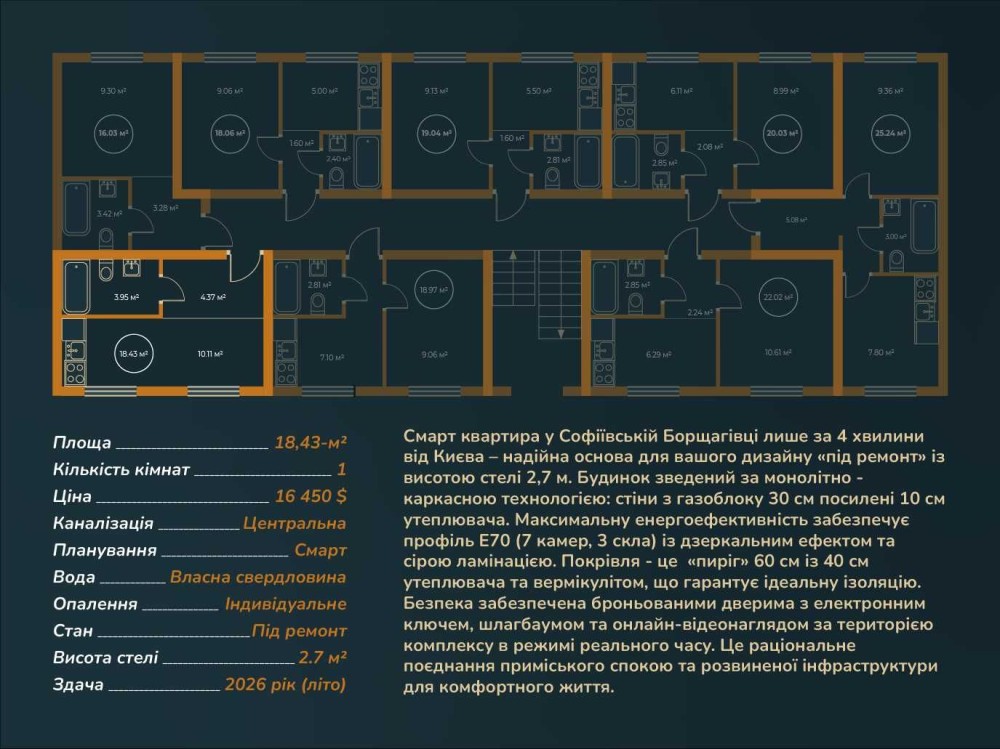 Смарт 18.43м² за 16 450 $. 4хв до Києва. Газове опалення. Забудовник.