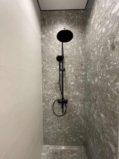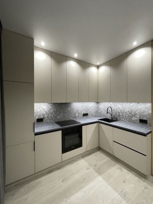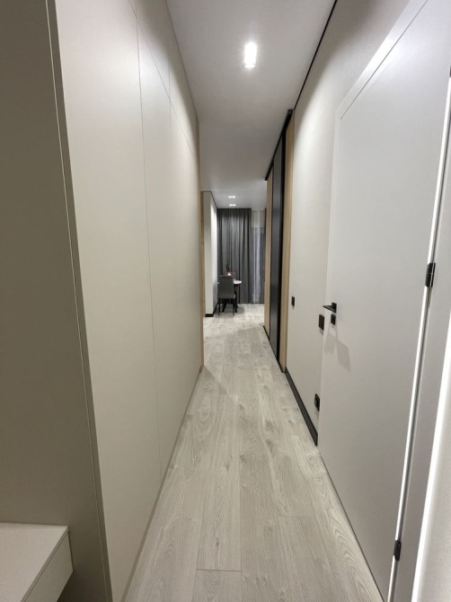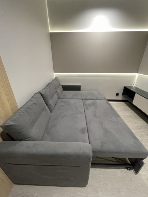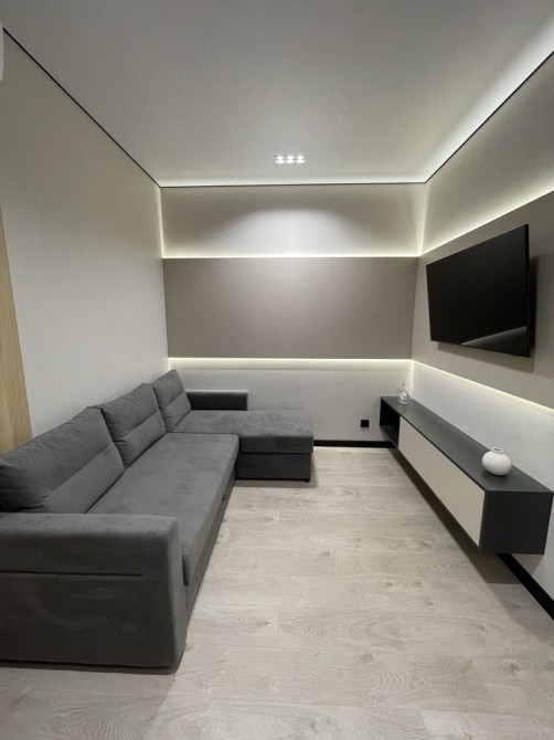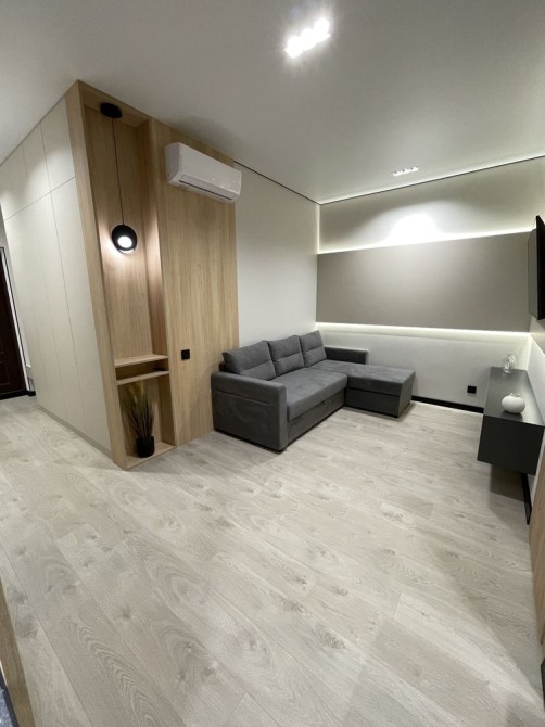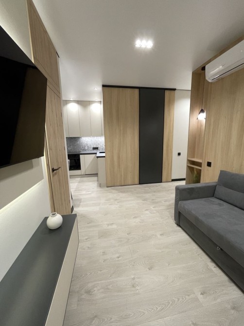 Самое лучшее место в квартире - это кухня-гостиная 19,3м с которой есть выход на открытую лоджию, откуда открывается красивый вид на море и город. Кухонный гарнитур под потолок со встроенной техникой немецкого производителя Bosh: холодильник, варочная поверхность, духовой шкаф и посудомоечная машина. Также на кухне стоит раскладной стол с двумя стульями. В гостиной расположен раскладной угловой диван, небольшая полочка со свесающим бра, а по стенкам вдоль установлена панель с подсветкой, на которую установили телевизор Самсунг 50 дюймов, а под ним повешена длинная полочка. Также с гостиной есть вход в гардеробную 2,2м с раздвижной дверью, которая ездит по деревянным панелям. Кроме того, на еще одной деревянной панели установлен мощный кондиционер люксового бренда CooperHunter, который может не только охладить всю квартиру, а еще и обогреть по необходимости.