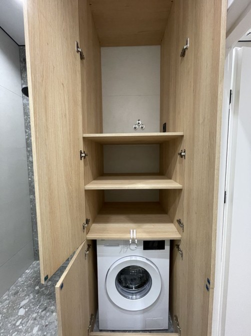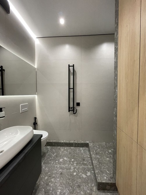 Справа по коридору вход в смежный санузел 4,3м с глубоким шкафом, в котором снизу установлена стиральная машина «Самсунг» (вместительностью 9кг и с возможность дозаправки), посередине - 2 полочки, а сверху место под ваши хозяйские вещи (швабра, веник и тп). За шкафом дешевая кабина с каленным стеклом и тропическим душем. Унитаз подвесной (установлена инсталляция) с гигиендушем. Умывальник авторский, а под ним тумба с 2 полками. Также установлено большое зеркало на всю стенку с подсветкой. Кроме того, в санузле установлен теплый пол и «дизайнерский полотенчик».