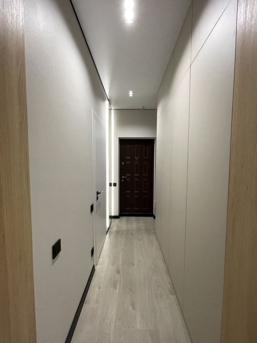 В квартире просторный коридор 4,6м с вместительным шкафом, зоной обувки и зеркалом с подсветкой на всю высоту стены.