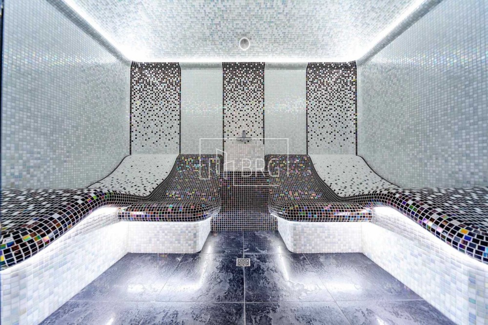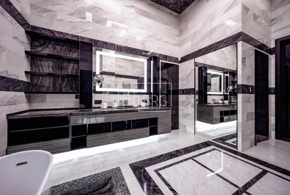 Описание: Гостиная с выходом на террасу, кухня, 4 спальни, 5 санузлов, 5 гардеробных. В цокольном этаже 100 м² дополнительных гардеробных, в 150 м² расположены: караоке (кинозал), римская парная, комната отдыха