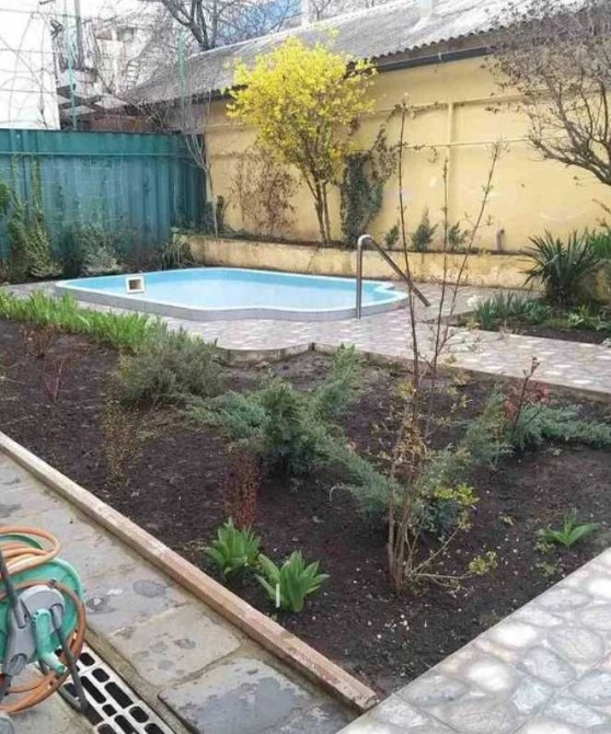 Располагается на участке, площадью 3,05 соток. Во дворе летняя площадка с барбекю и бассейном.