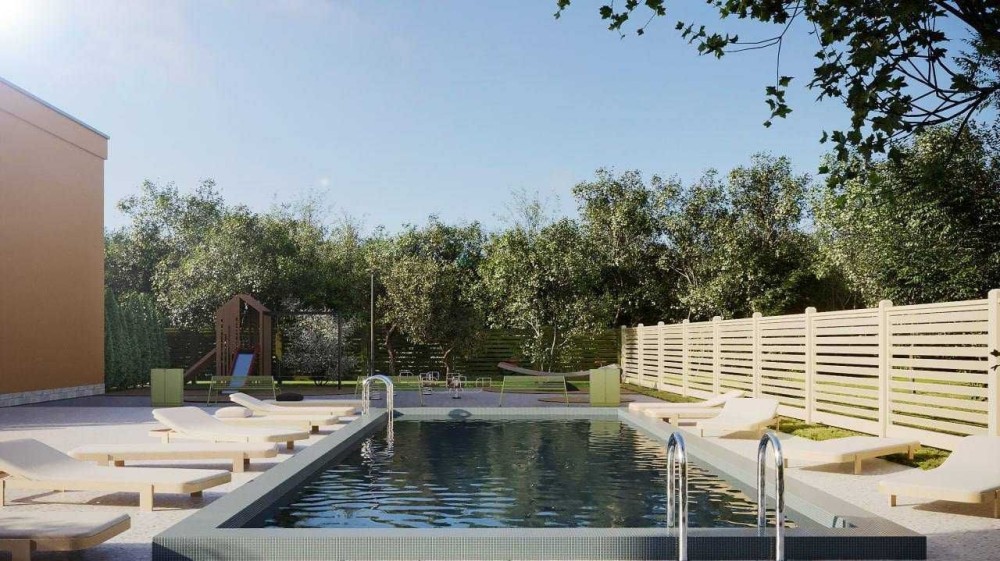 Бассейн, детские площадки и ландшафтное озеленение.