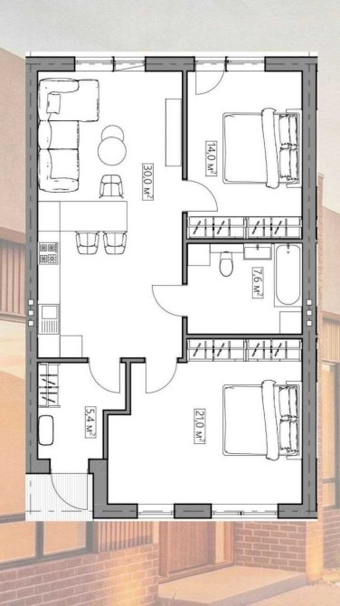 - Простора кухня - вітальня (30кв.м.) та комфортні спальні (21 та 14 кв.м.)