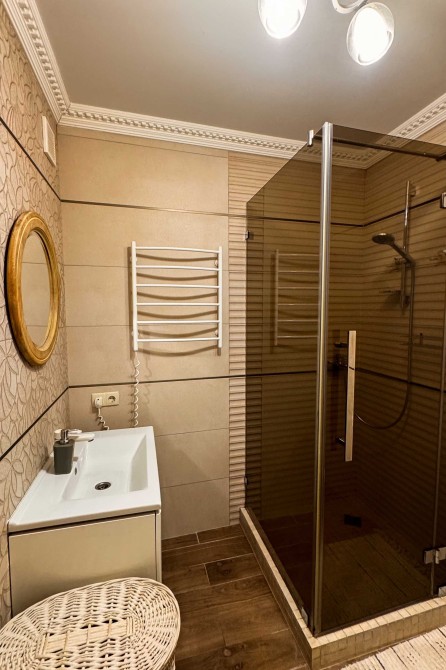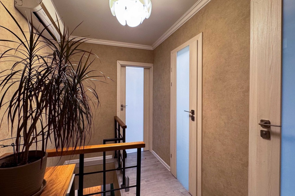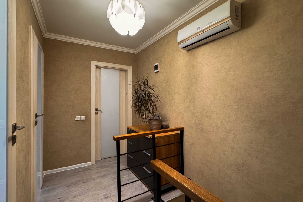 Зроблений трендовий ремонт з якісних матеріалів в цілях власного проживання. Розведена тепла підлога в ванній кімнаті на другому поверсі. Замінена вся електрика та сантехніка. Встановлені надійні металопластикові 5-ти камерні вікна. Повністю замінено дах на будинку. Зручні дерев’яні сходи з бука. Квартира продається з усіма наявними меблями та технікою (посудомийна машина, холодильник, духова шафа та варильна поверхня, пральна машина тощо). Вбудована кухня та сантехніка італійського виробництва.