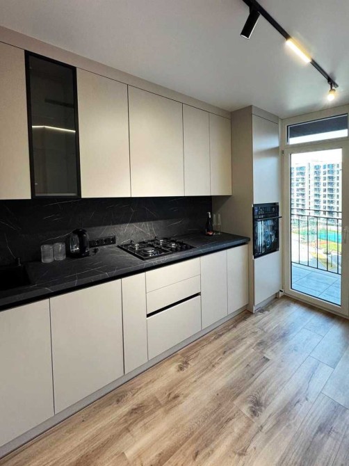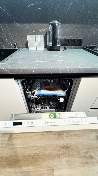 Є вся необхідна техніка, включаючи газову варильну поверхню, духову шафу, посудомийку, інверторний кондиціонер, пральну машинку з функцією сушки, телевізор.