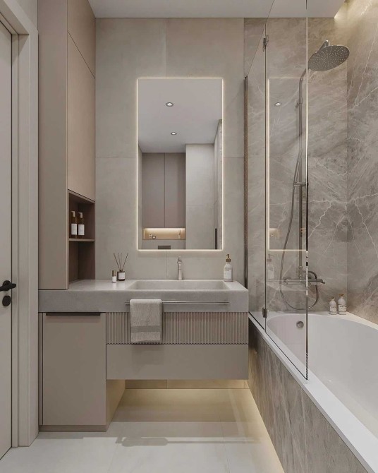• сучасний санвузол із ванною, інсталяцією та дзеркалом з підсвіткою