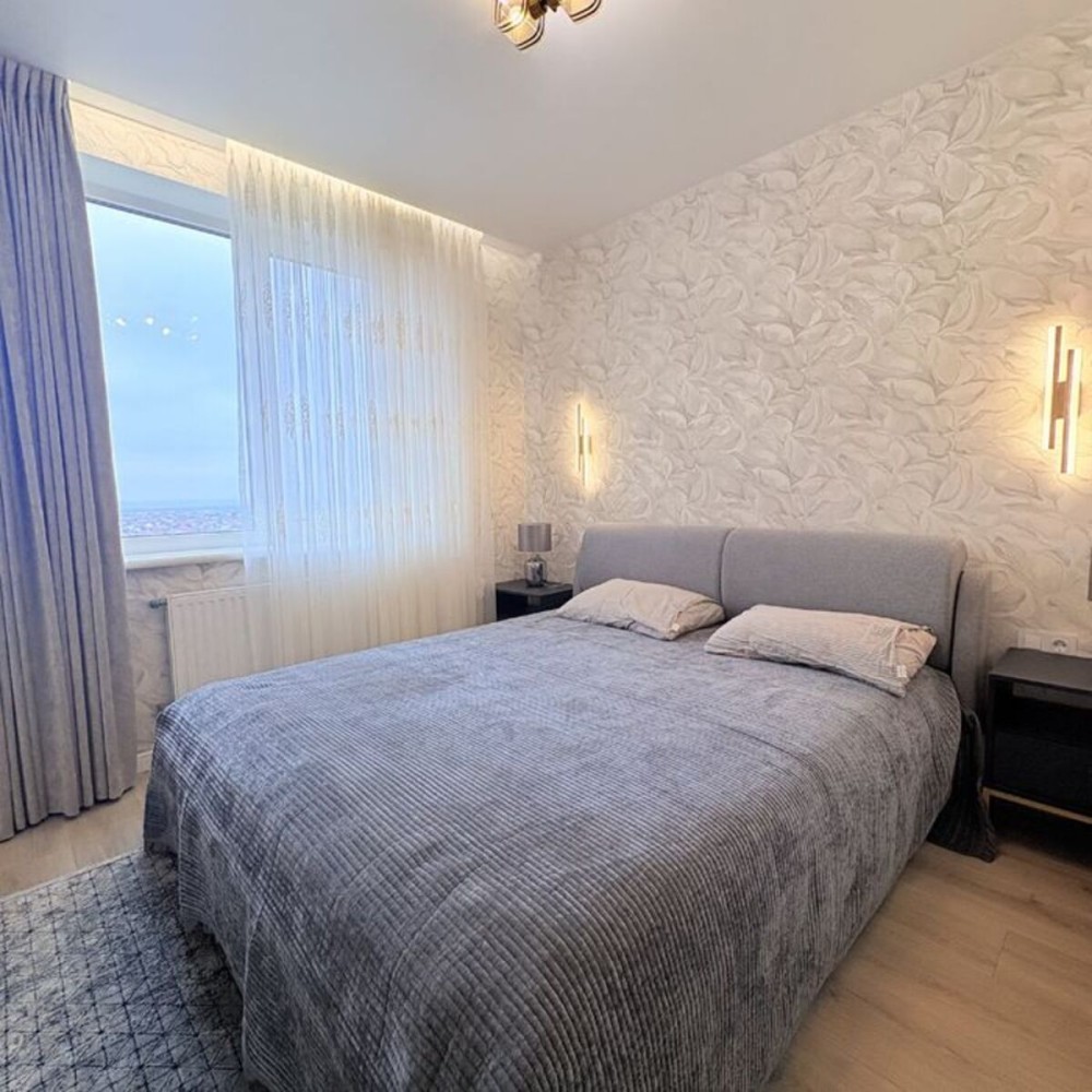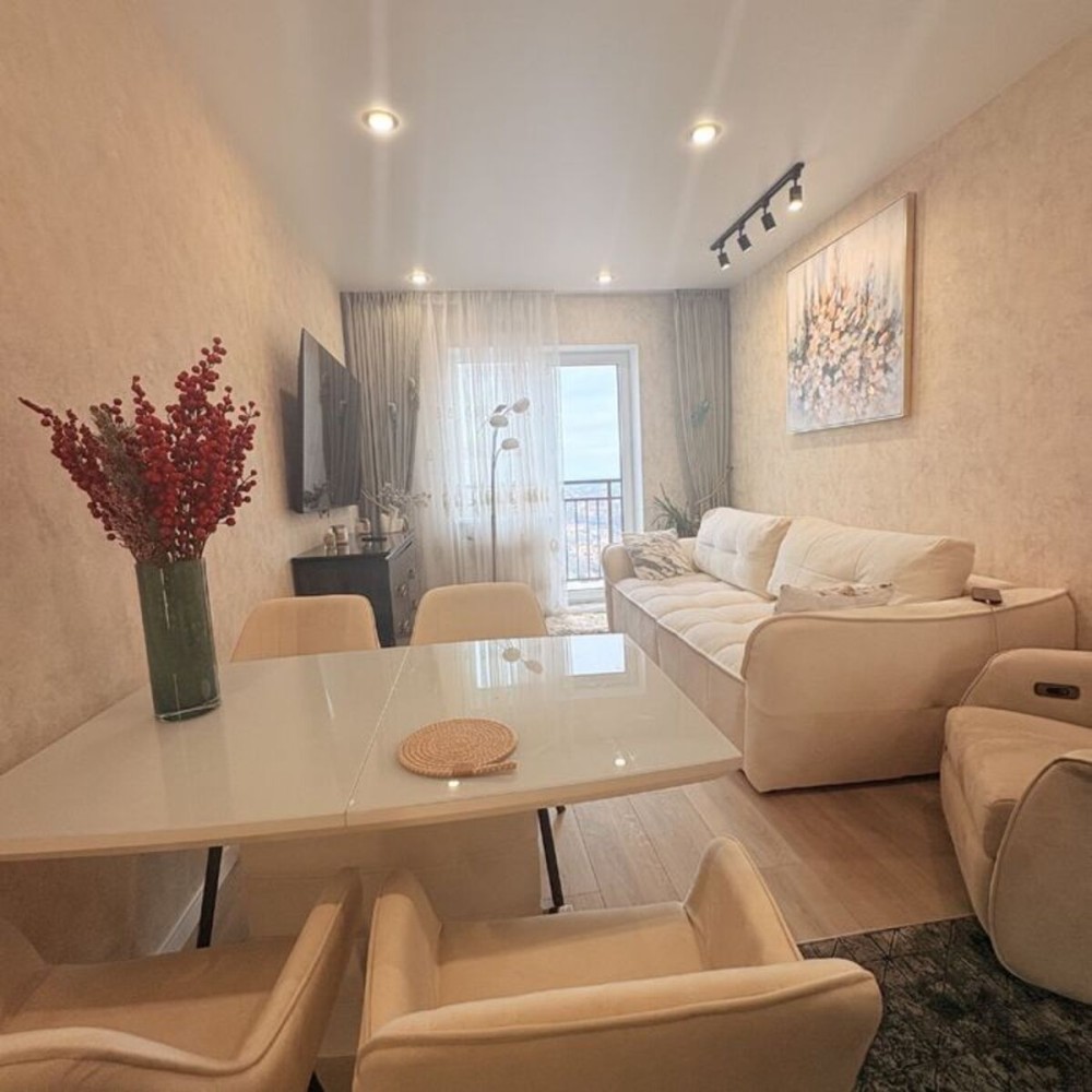 Большая двухкомнатная квартира площадью 62 м² с качественным и дорогим евроремонтом. Планировка продумана для максимального комфорта: две раздельные спальни, просторная кухня-гостиная, отдельная гардеробная и совмещенный санузел. Квартира полностью укомплектована премиальной бытовой техникой брендов Bosch и Siemens. Интерьер дополнен мебелью из натурального дерева итальянского производства (прикроватные тумбы, комод). В каждой комнате установлены вместительные шкафы. Особое преимущество — наличие собственного балкона с красивым видом.