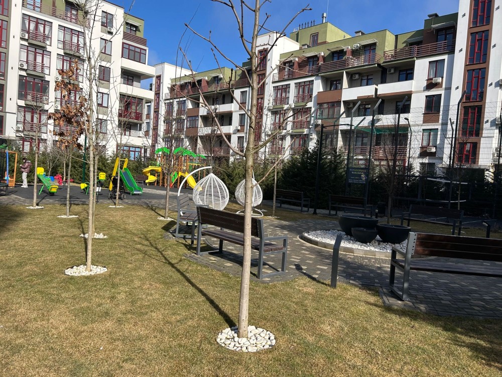 Ухоженная и охраняемая придомовая территория с качелями и лавочками.