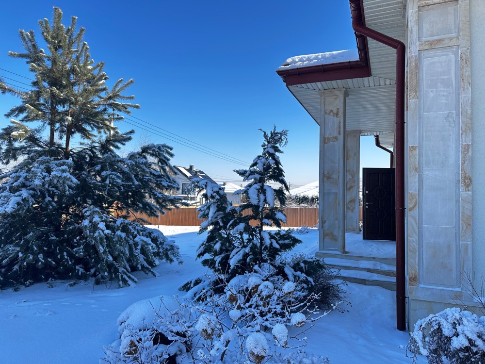 Дах будинку побудований з цементно-піщаної черепиці - термін експлуатації більше 80 років, має відмінну звукоізоляцію (зовсім не чути дощу) і теплоізоляцію (немає конденсату)