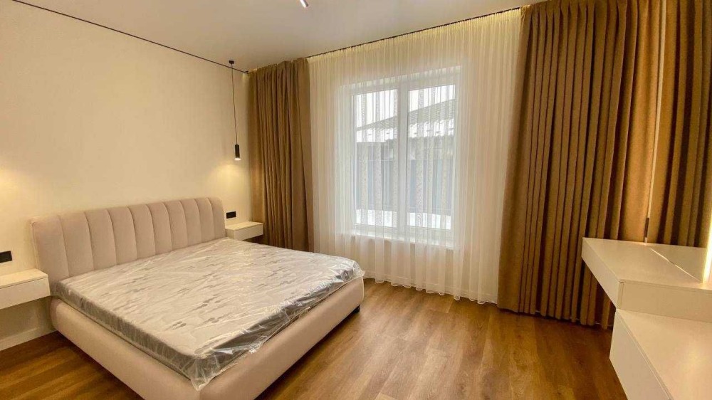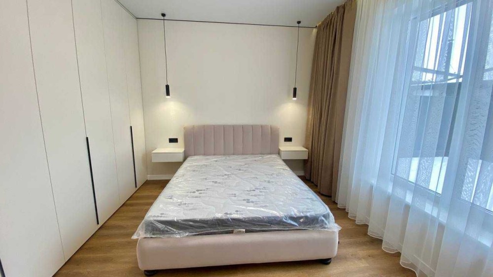 Одна спальня повністю укомплектована: ліжко, шафа, приліжкові тумбочки, дзеркало з підсвіткою. В кожній кімнаті — підсвітка карнизів, що створює особливу атмосферу затишку.
