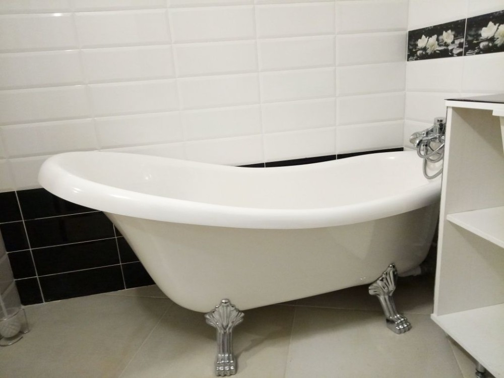 Королівська ванна: Окрема ванна на декоративних ніжках, сучасна сантехніка, велика мийка та пральна машина , бойлер та водяний підігрів підлоги.