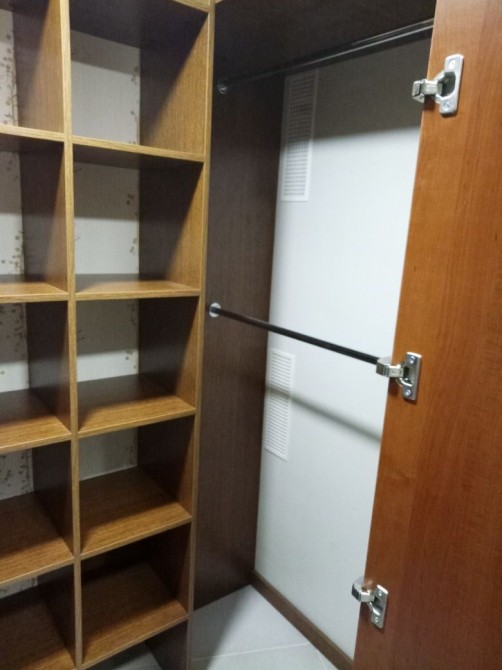 Система зберігання: Велика окрема гардеробна кімната з полицями та штангами для одягу — весь простір квартири залишається вільним від зайвих шаф.