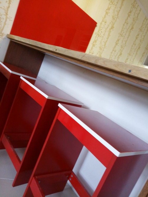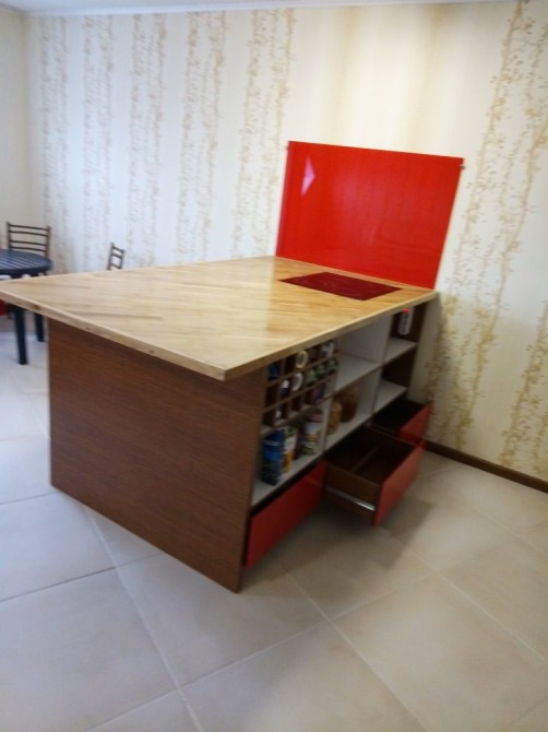 Стильна кухня-острівець: Яскрава червона кухня з функціональним острівцем, вбудованою варильною поверхнею та барною зоною. Багато місця для зберігання та круте LED-підсвічування.