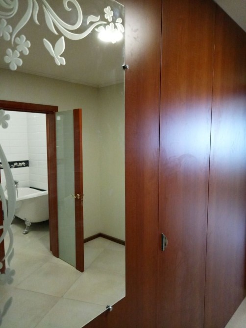 Зона відпочинку: Велике двоспальне ліжко . На підлозі — паркет (масив , дуб) та плитка .