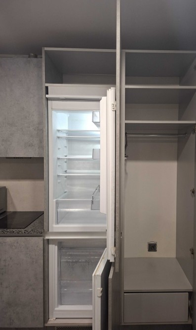 Кухня укомплектована всією необхідною побутовою технікою (холодильник, пральна машина, чайник, кухонна плита, витяжка) та повним набором кухонного посуду.
