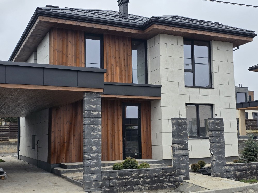 Будинок побудований з керамічної цегли, утеплювач 15 см, перекриття моноліт. Дах утеплений, пвх мембрана. Фасад плитка, штукатурка, дерево, метал.