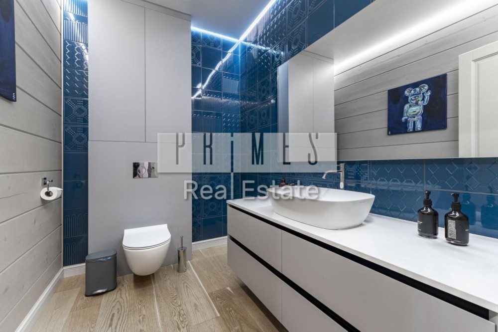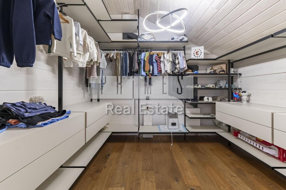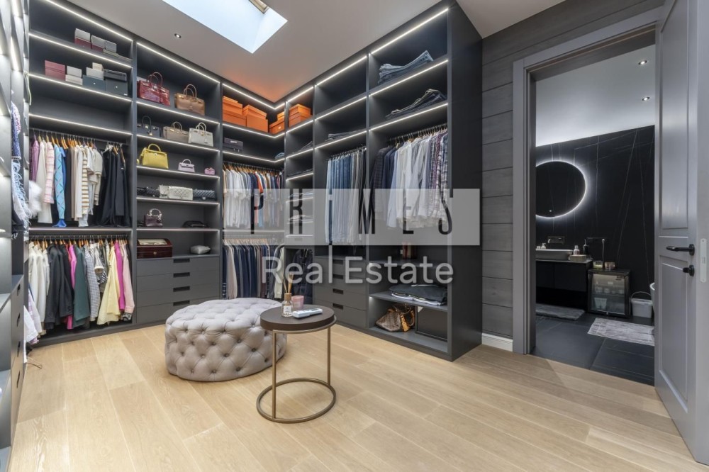 1 поверх: простора кухня-вітальня 85 м² з іншим світлом та виходами на терасі, головна спальня з власним санвузлом та гардеробом, дитяча з ванною та гардеробною, гостинний санвузол, прихожа з вбудованими шафами, пральня з окремим входом та санвузлом для персоналу.