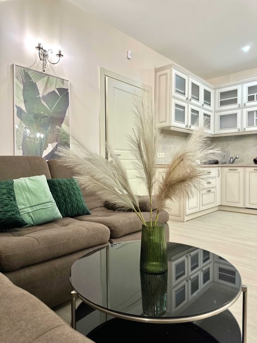 - Простора кухня-вітальня з великим розкладним диваном з нішами для зберігання.