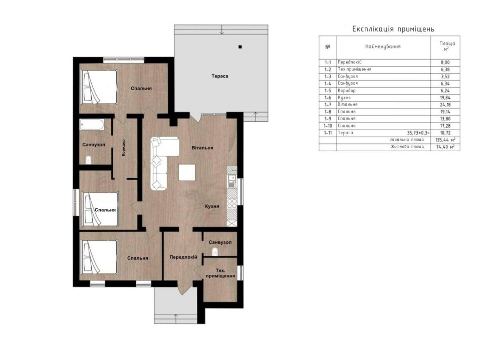 Планування: 3 спальні, кухня-вітальня, 2 санвузли, технічна кімната.