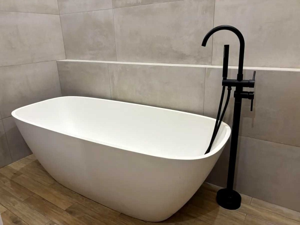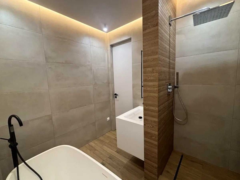 Ванна кімната з окремо стоячою ванною та душовою кабіною