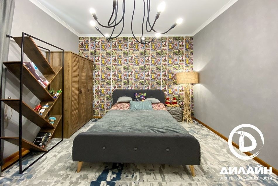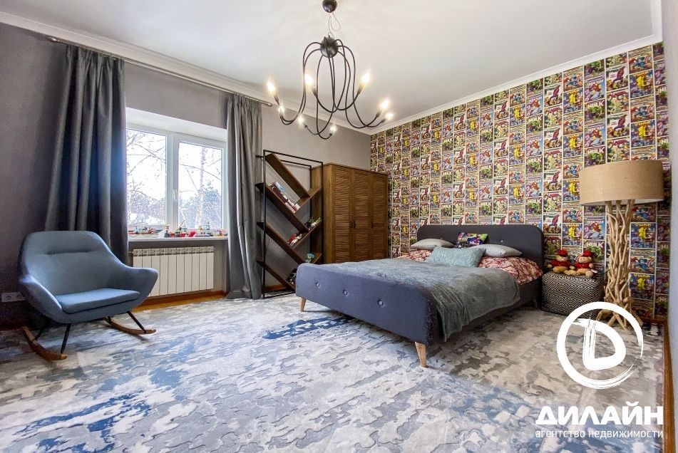 Хол, кабінет, ванна кімната, гардеробна, господарська спальня, дитяча кімната, балкон.