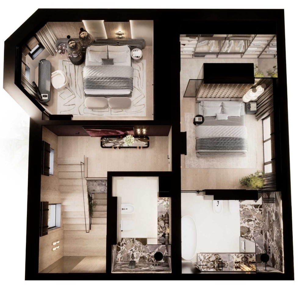 - 2 поверх: майстер-спальня з власним санвузлом, гардеробною та виходом на балкон (за потреби можна перепланувати у 2 окремі спальні), дитяча спальня, санвузол, вихід на мансардний поверх