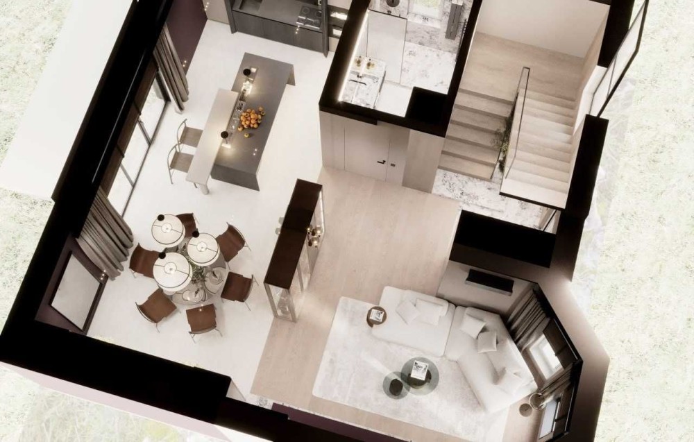 - 1 поверх: відокремлена вітальня з відпочинковою зоною, велика кухня з острівцем та обідньою частиною, вихід на власну терасу, санвузол