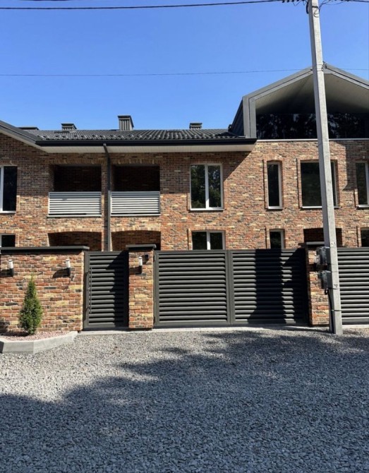 паркан з цегляними колонами та металевими жалюзі автоматичні ворота