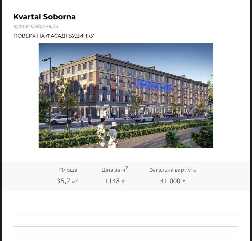 Продається 1-кімнатна квартира в ЖК “Kvartal Soborna”, вул. Соборна, 33.