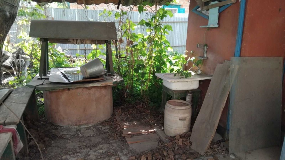 Зручний заїзд на подвір'я, металевий паркан і брама, колодязь.