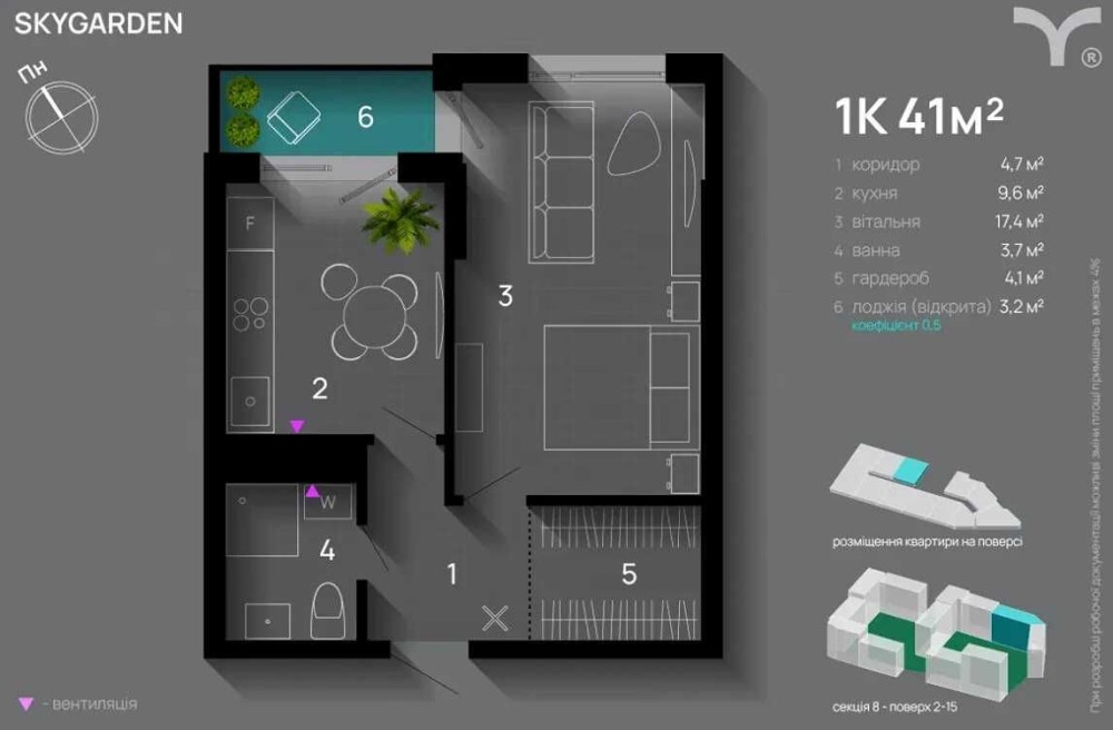 Квартира внутрішня та світла, має функціональне планування загальною площею 41м2, Воно включає в себе: прихожу, санвузол, гардеробну, кухню з виходом на балкон та простору спальню.