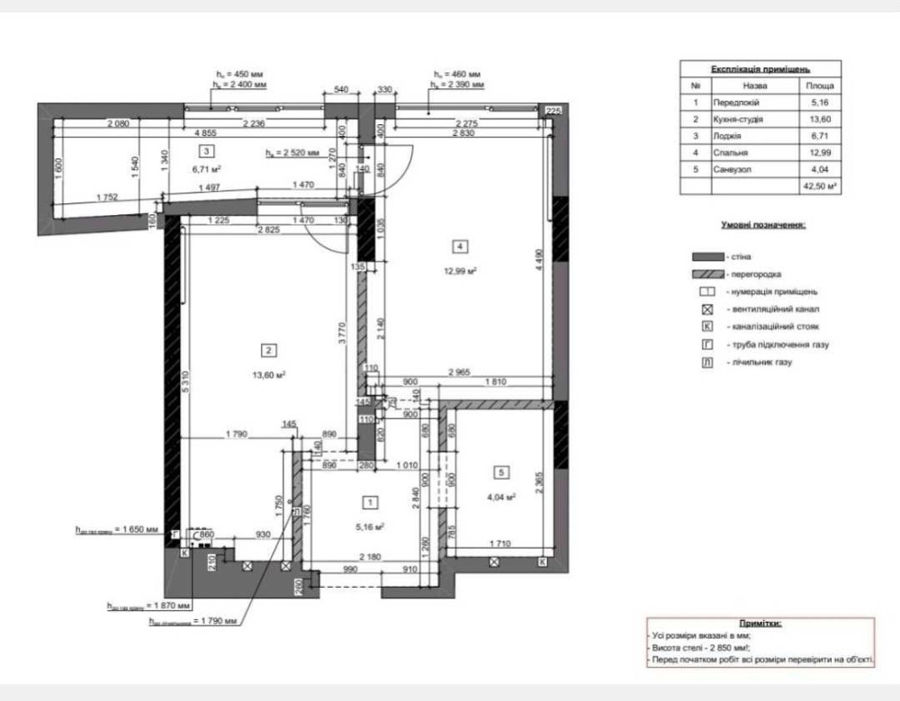 • заг.площа 42,5 м.кв./ кухня-студія 13,6м.кв.