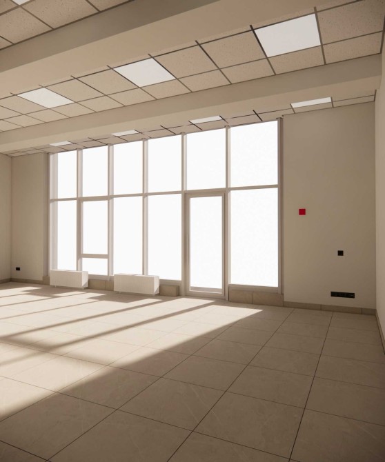 Об’єкт розташований на 1-му поверсі нового 24-поверхового будинку з прямим входом із тротуару та великими вітринами на проїжджу частину. Локація з постійним пішохідним і автомобільним трафіком.