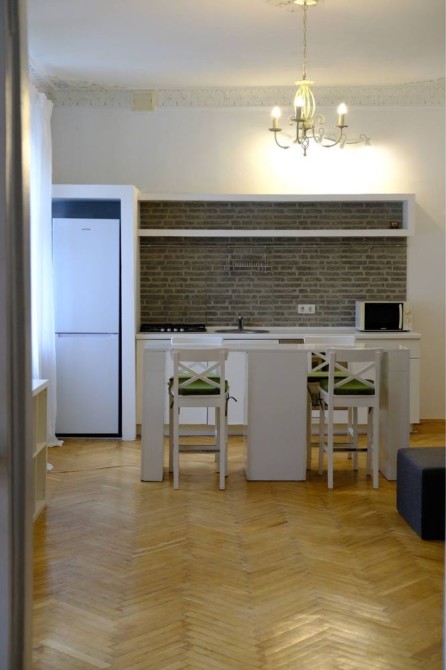 Тут комфортно жити сім’ї, парі чи тим, хто працює з дому: простора кухня-студія може стати одночасно і робочим простором, і місцем відпочинку.