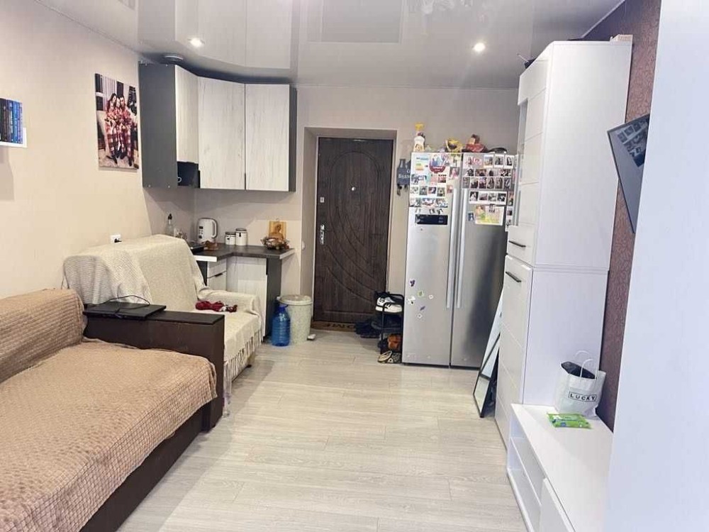 Кімната поділена на кухонну зону та зону відпочинку.