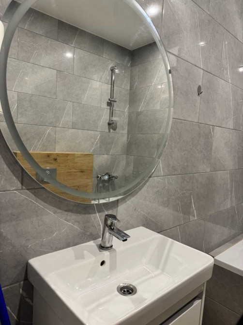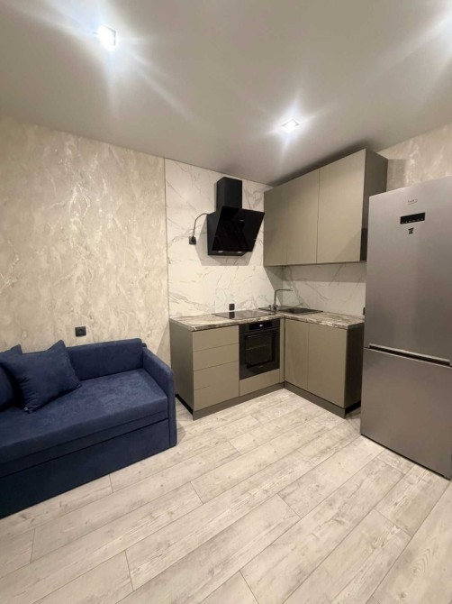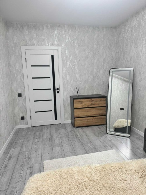 Затишна та світла спальна кімната із двоспальним ліжком та стильними деталями у вигляді підлогового дзеркала з інтегрованою підсвіткою, LED - освітлення. Лаконічна кухня у відтінку хаскі та затишний диван для вечірнього релаксу .
