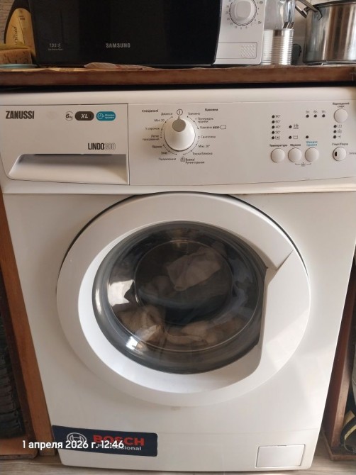 Кухня с газовой плитой, стиральной машинкой, большим холодильником, микроволновкой.