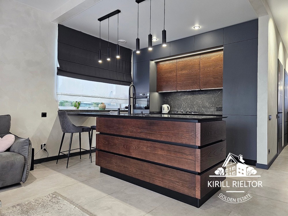 - кухня из шпона, с островом с крашеными элементами декора и компакт-плиты, смеситель и мойка "Blanko" (Германия). Установлена фурнитура "BLUM";