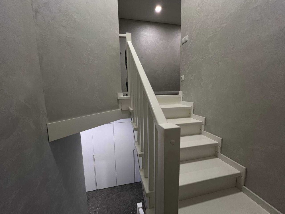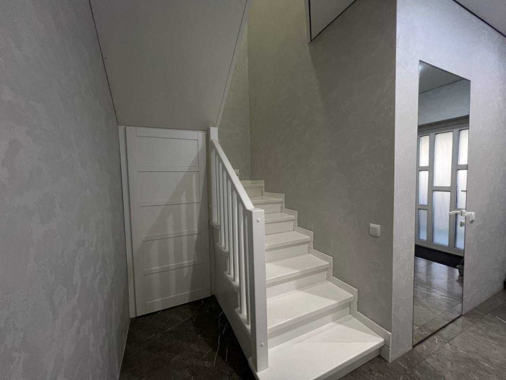 По всій підлозі першого поверху, також на стінах в санвузлі і кухні - дорогий італійський нековзний керамограніт 120х60 см (одночасно полірований і шероховатий - НЕ слизький, див. останні фото) , на другому поверсі - ламінат, стіни - декоративна штукатурка