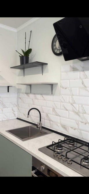 У кухні свіжо пофарбовані стіни, нова кухня зі стільницею.