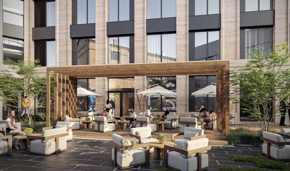 - Внутрішній двір з патіо, вуличними камінами, рестораном, салоном краси та спортзалою
