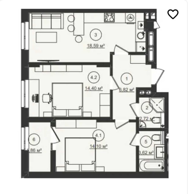 • Площа кухні 18.59 м2