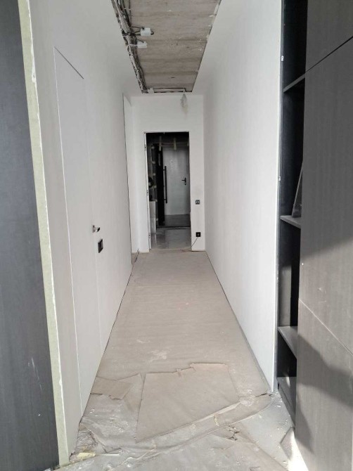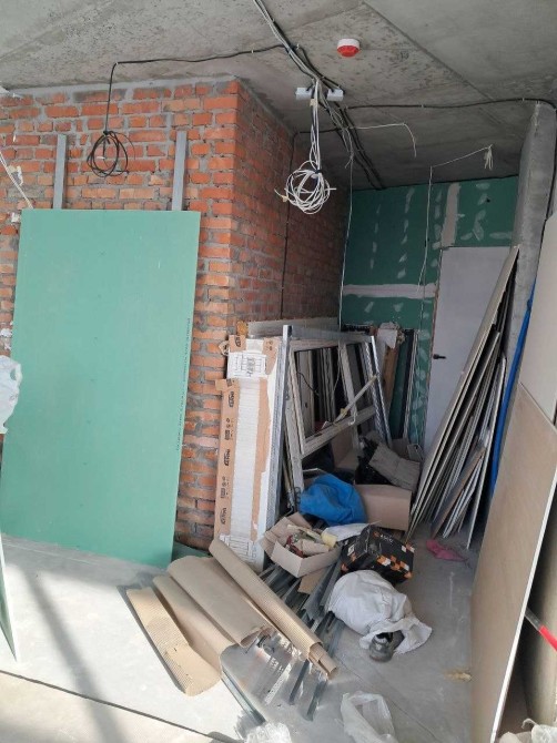 В передпокою покладена плитка на підлогу, готові пофарбовані стіни з молдінгами, встановлені міжкімнатні двері(прихованого монтажу), розведена електрика, встановлені вимикачі, розумний будинок, тепла підлога, частково покладений ламiнат (ламінат, який треба докласти лежить у пачках), зібрана кухонна стінка.